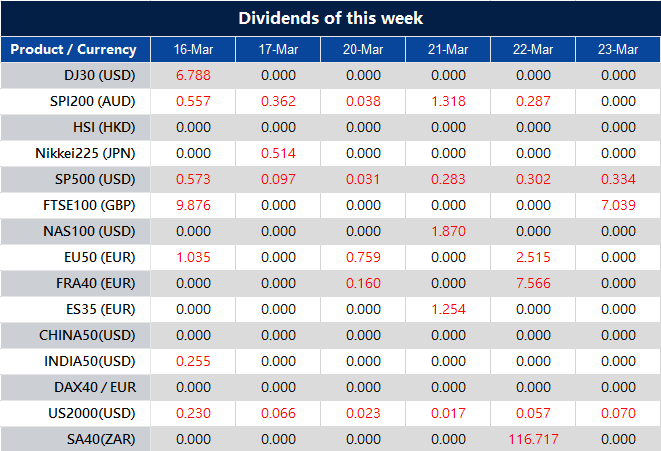 Please note that the dividends of the following products will be adjusted accordingly. Index dividends will be executed separately through a balance statement directly to your trading account, and the comment will be in the following format “Div & Product Name & Net Volume ”.