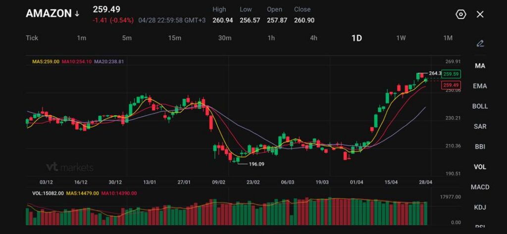 - Amazon traded at 259.49, down 1.41 points, or 0.54%, after touching a session high of 260.94.