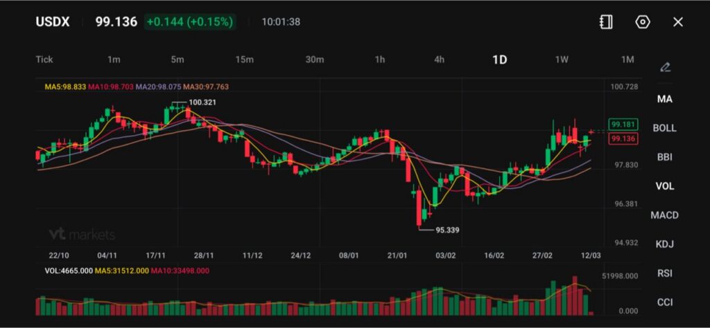 The index has been trending gradually higher over the past few weeks, reflecting renewed demand for the dollar amid heightened global uncertainty and shifting macro expectations.