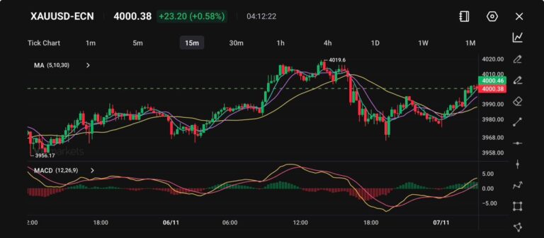 Gold (XAU/USD) hovered close to $4,000, recovering from earlier dips as buying interest slowly returned. On the 15-minute chart, the metal appears to be consolidating after reaching an intraday peak near $4,019, with short-term moving averages (5, 10, 30) converging, a signal of potential stabilisation.