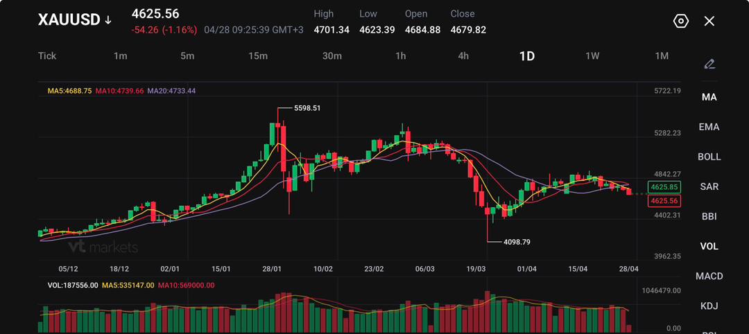 - XAU/USD traded at 4,625.56 on the chart, down 54.26 points, or 1.16%, with price below its 5-day, 10-day, and 20-day moving averages.