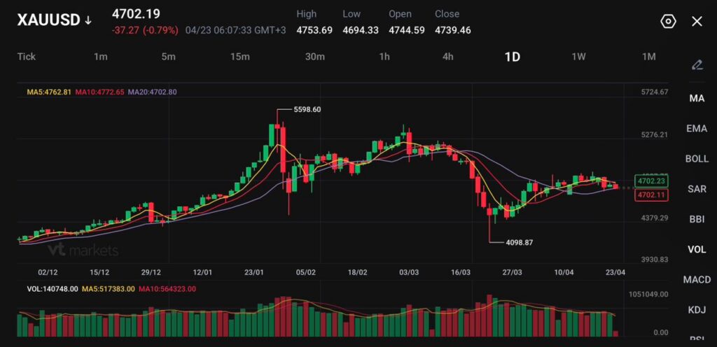 Gold eased lower in choppy trade as the market shifted its focus back to inflation risk, driven by a renewed surge in oil prices. Spot gold fell 0.7% to $4,705.09 per ounce, while U.S. gold futures for June delivery slipped 0.6% to $4,722.10.