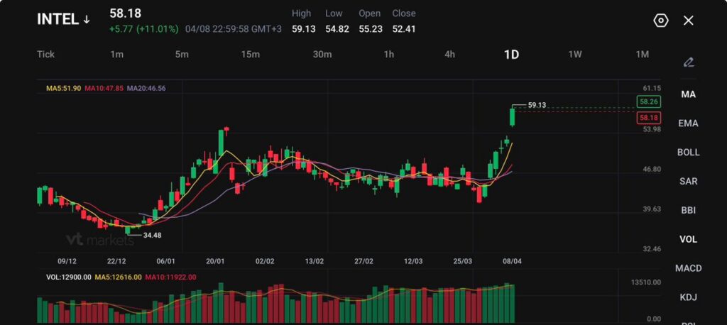 Intel shares surged as traders rotated back into semiconductor stocks and looked for names with clearer AI infrastructure exposure. The stock climbed 11% to 58.18, hit an intraday high of 59.13, and closed well above the prior 52.41 close.