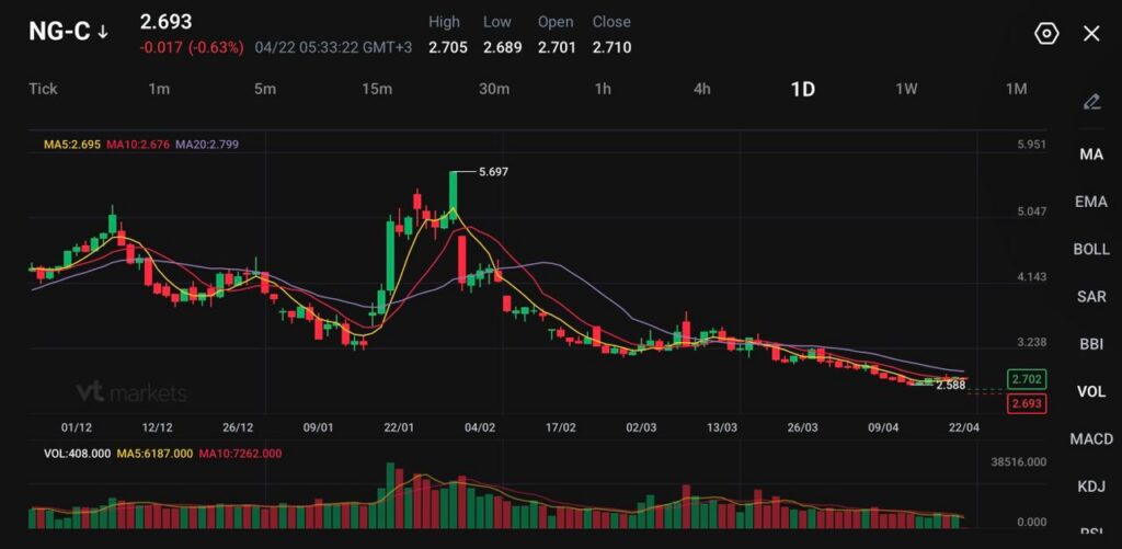 • NG-C trades at 2.693, down 0.017 (-0.63%), after a high of 2.705 and a low of 2.689.