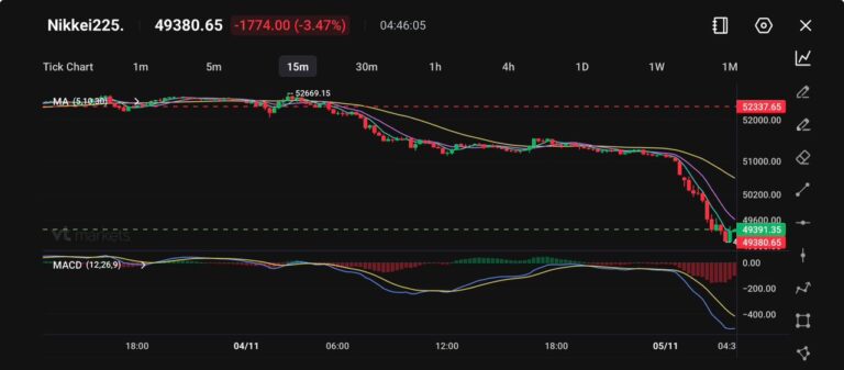 The Nikkei 225’s sharp 3.5% drop to 49,380.65 erased part of its recent rally, pulling it back beneath the psychological 50,000 threshold. The steep reversal comes after an extended uptrend, signalling potential weakness in the short-term outlook.
