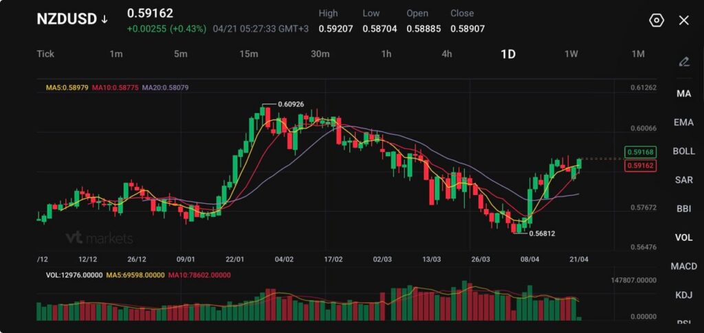 - NZDUSD trades at 0.59162, up 0.00255 (+0.43%), after touching 0.59207 and moving close to the recent five-week high zone.