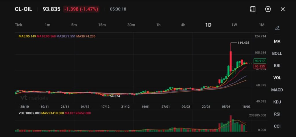 Crude oil (CL-OIL) is trading around $93.83, down roughly 1.47% on the session, as the market pauses following an aggressive rally that pushed prices to a recent high near $119.43.