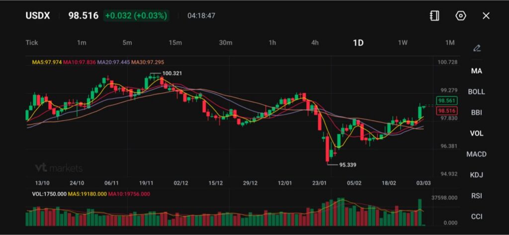 The US Dollar Index (USDX) is trading near 98.52, marginally higher on the session, as the dollar continues to stabilise following its rebound from the 95.34 January low. The broader structure shows a recovery phase underway after the sharp mid-winter decline.
