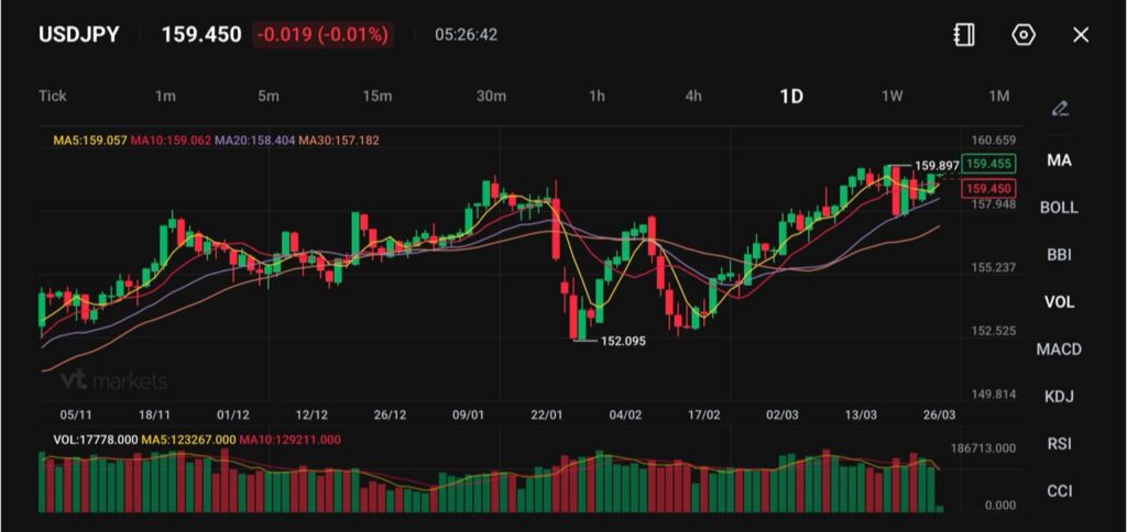 USDJPY is currently trading near 159.45, reflecting renewed demand for the U.S. dollar as geopolitical uncertainty persists.