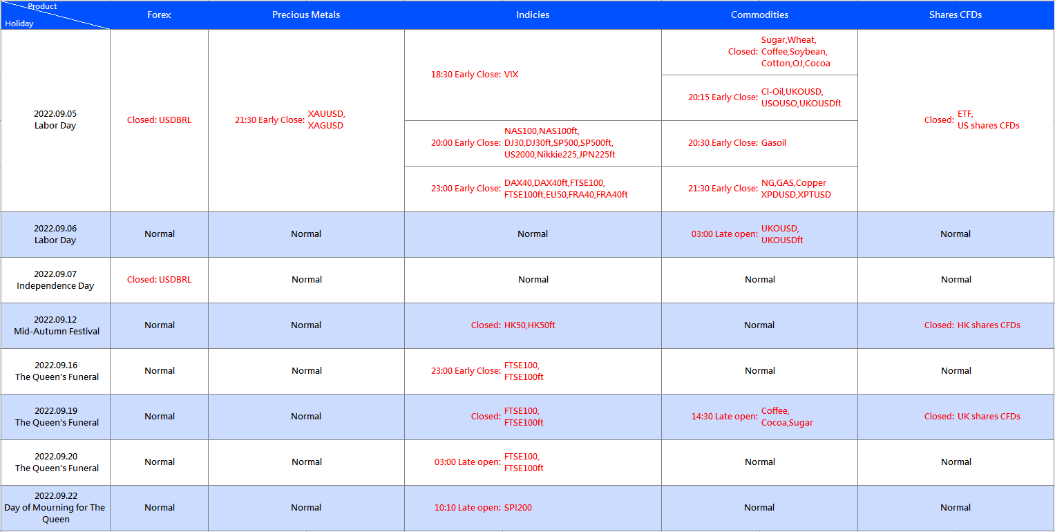 Please note the adjustment on the following products due to the international holiday in September: