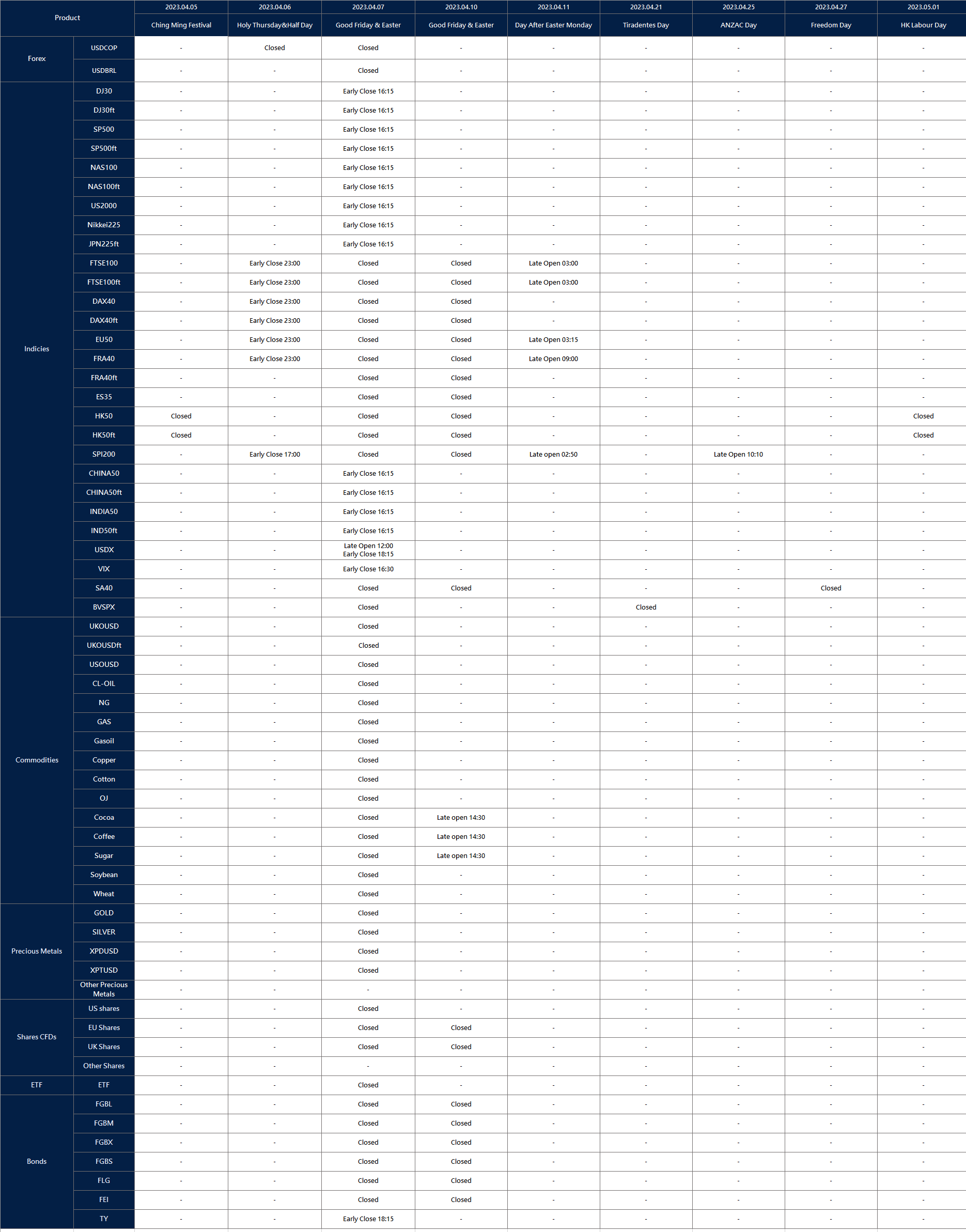 Please note that the following instruments’ trading hours will be affected by the upcoming holidays.