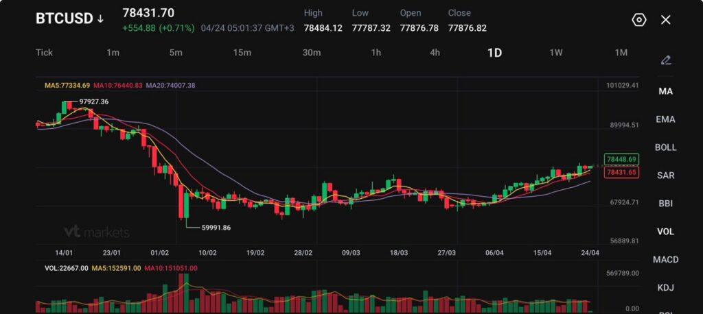 Bitcoin cuba menukar lantunan kepada pemulihan yang berkekalan. Pada masa penulisan, BTCUSD didagangkan berhampiran $78,431.70, naik $554.88 atau 0.71%, dengan carta menunjukkan paras tinggi $78,484.12, paras rendah $77,787.32, pembukaan pada $77,876.78, dan rujukan penutupan $77,876.82.