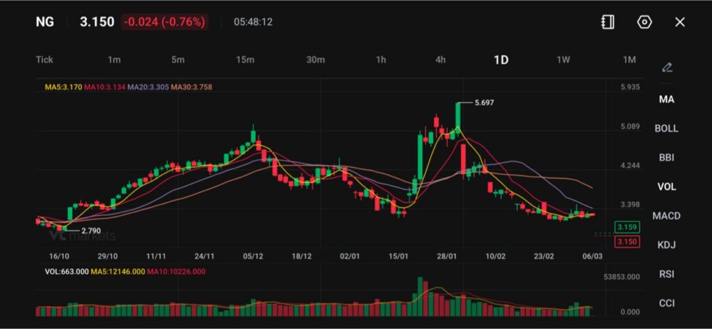 • Pada carta, NG didagangkan pada 3.150, turun 0.024 (-0.76%), dengan MA5 3.170 dan MA10 3.134 sebagai penanda jangka pendek (MA ialah purata bergerak, iaitu purata harga bagi beberapa hari untuk melihat arah aliran).