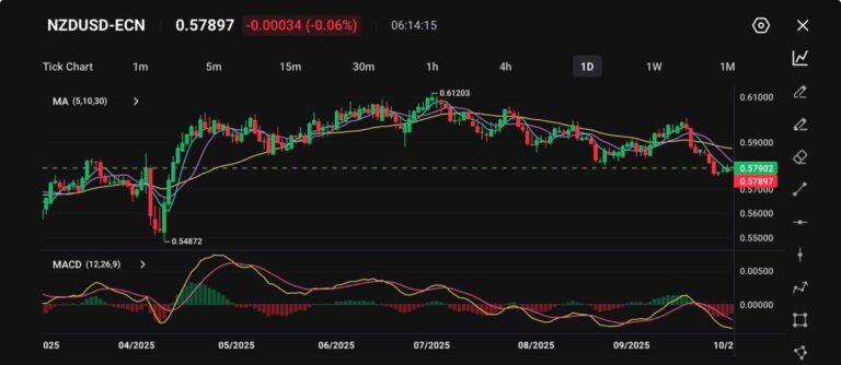 Dolar New Zealand (NZDUSD) terus bergelut, didagangkan pada 0.57897, susut 0.06%, dengan aksi harga kekal condong ke arah penurunan ketika pasangan itu merosot lebih jauh di bawah paras 0.58.