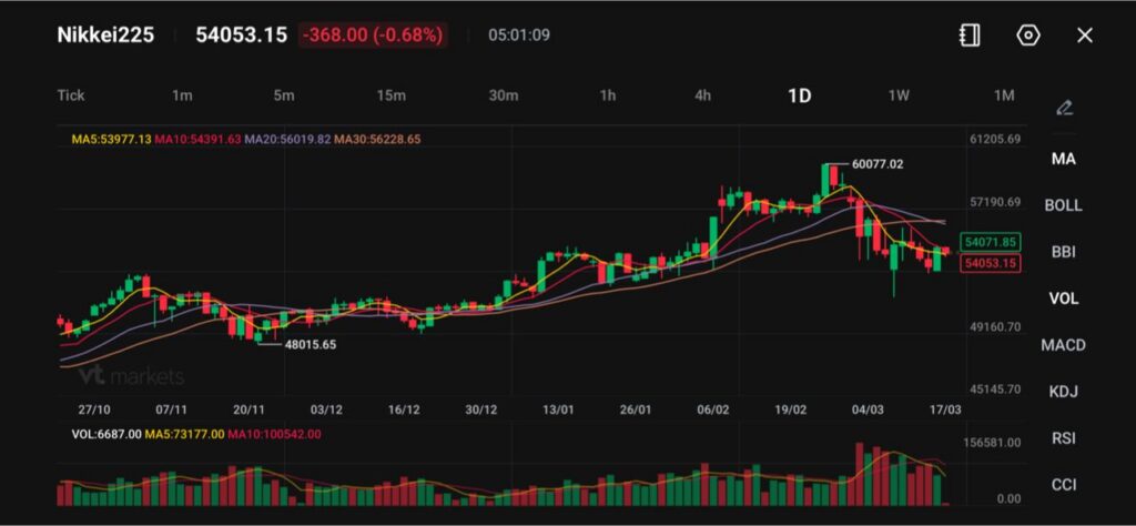 Nikkei 225 cuba untuk pulih, namun latar belakang kekal mencabar. Ekuiti Asia yang lebih luas meningkat pada Selasa, dan Nikkei 225 Jepun naik 0.3% apabila pedagang mengejar hari kedua kenaikan. Walau bagaimanapun, nada keseluruhan masih berhati-hati apabila pasaran cuba menilai kerosakan ekonomi daripada perang AS-Iran serta tindak balas dasar yang mungkin dicetuskan.