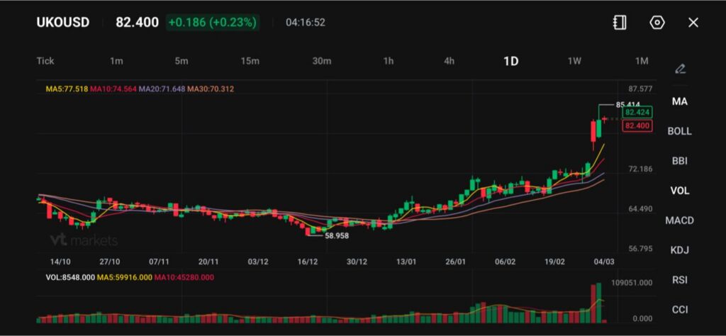 Harga minyak kekal tinggi, dengan UKOUSD (Brent Crude)—instrumen dagangan yang menjejak harga Brent dalam dolar AS—didagangkan berhampiran $82.40, hampir dengan paras tinggi terbaru selepas lonjakan kuat dari paras rendah Disember sekitar $58.96. Corak harian menunjukkan trend menaik yang jelas, disokong oleh siri paras tinggi lebih tinggi dan paras rendah lebih tinggi sejak awal tahun.