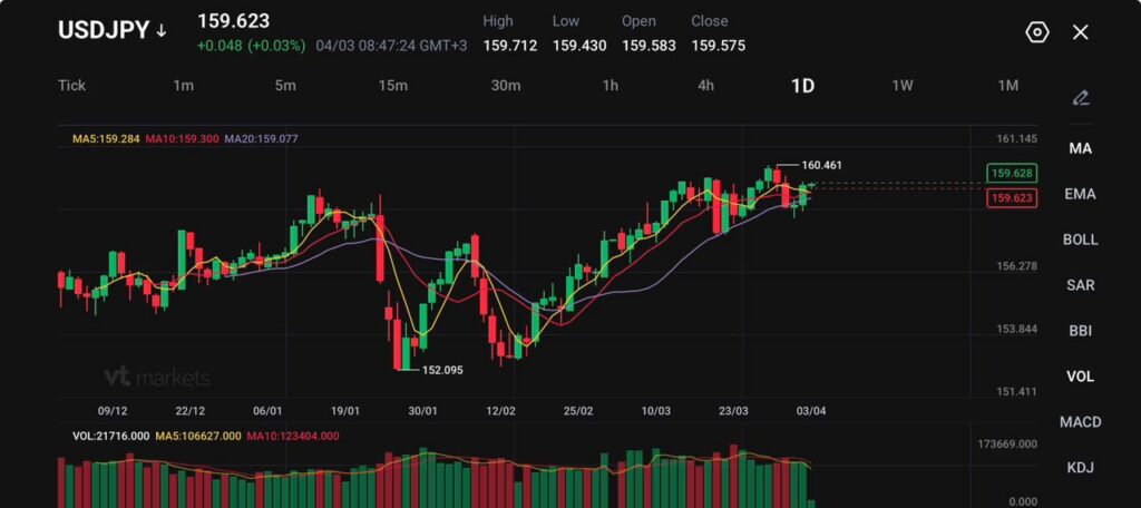 USDJPY kekal tinggi kerana pasaran masih memihak kepada dolar apabila harga minyak kukuh, risiko geopolitik meningkat, dan Bank of Japan belum memberikan isyarat dasar yang benar-benar meyakinkan kepada pedagang. Carta anda menunjukkan USDJPY pada 159.623, masih hampir dengan paras tinggi terkini pada 160.461.