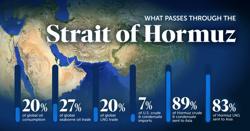 Selat Hormuz mengendalikan kira-kira 20% penggunaan minyak global, di samping bahagian besar aliran gas asli cecair (LNG), khususnya dari Qatar. Sebarang gangguan di sini tidak menggerakkan pasaran secara perlahan. Ia memaksa penetapan harga semula.