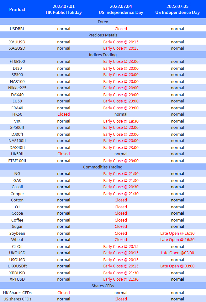 The above time is MT4/5 server time. The trading time of other products is not affected. The above data may be subject to change. Please refer to the actual time on MT4/5.