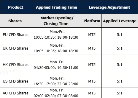 2. MT5 All Shares products dynamic leverage: New positions opened within 30 minutes before market closing and after market opening will start with a leverage of 5:1. After the mentioned period, the leverage will be resumed to original leverage and will not be adjusted back to 5:1.