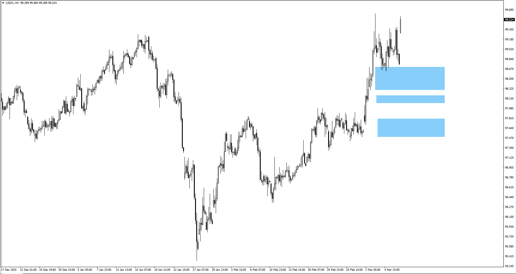 Dollar Index AS baru-baru ini membuka dengan jurang harga lebih tinggi, dengan 99.631 sebagai rintangan terdekat. Jika dolar menembusi paras ini, ia boleh bergerak ke 100.321, mengukuhkan mata wang dan berpotensi menekan komoditi seperti emas.