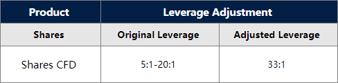 1. 全部股票产品丛原杠杆 5:1-20:1 调整为全时段 33:1,并取消因应开市及收盘的杠杆调整。
