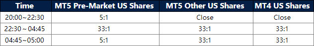 2. MT5 20只盘前可交易的美股:盘前交易时段 20:00-22:30 与收盘前15分钟04:45-05:00 杠杆为 5:1,其他时段杠杆为 33:1。