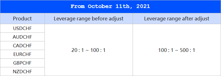 VT Markets 将于 2021 年 10 月 11 日调升所有瑞郎系货币兑的杠杆范围,具体调整内容如下: