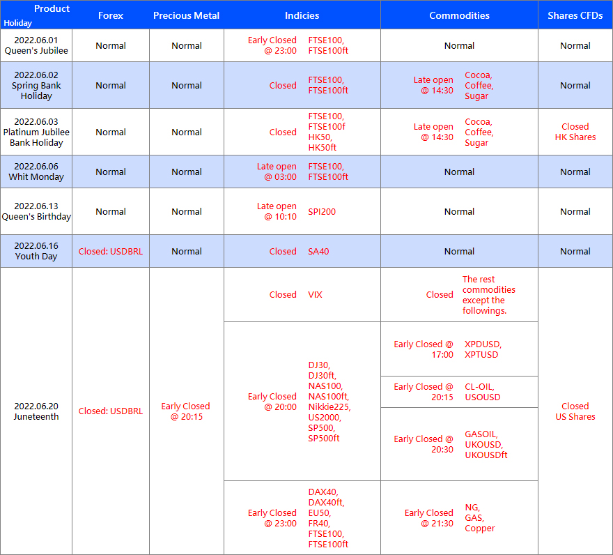受到 6 月国际节假日影响,VT Markets 部分产品交易时间将有所调整,详情请查看如下: