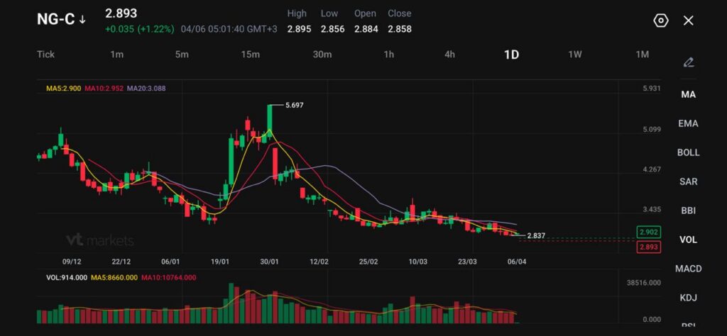 天然气(NG)现约2.89,靠近近期低位。此前从年内5.69高点大跌后,市场仍缺乏明确方向。价格波动偏小,K线(蜡烛图,用来显示开高低收)显示反弹乏力,持续买盘不足。