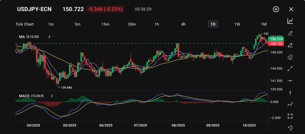 5日均线趋于走平,显示上行动能放缓,而10日均线逐步上移,可能成为动态支撑。下方关键支撑位在149.50附近,其次为148.30,即此前的盘整区域。