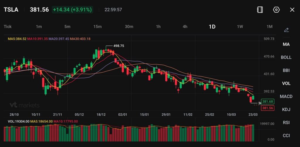 Tesla(TSLA)在381.56附近交易,当天上涨约3.91%。股价在自498.75高点以来的长时间下跌后出现短线反弹;不过整体形态仍显示卖压偏重(偏空)。