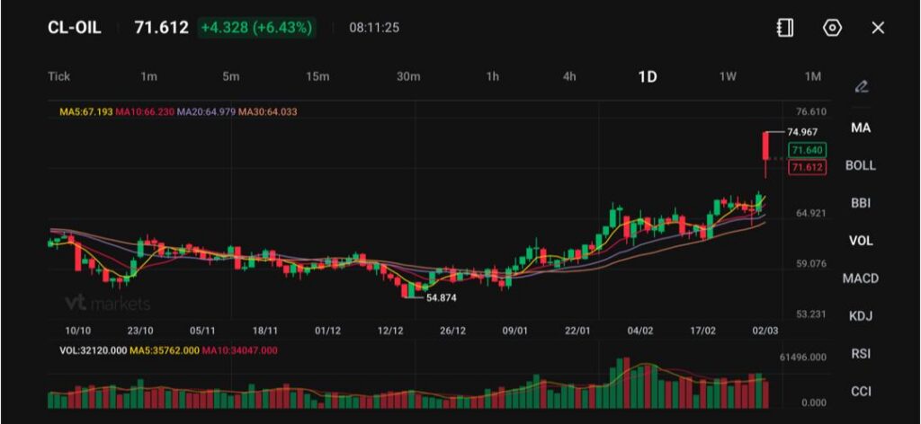 日线图显示一根强势阳线(看涨K线:收盘价高于开盘价),价格冲破此前67.00–69.00的阻力区(阻力:价格上行容易受压的区域),并短暂测试74.96高点。该走势延续了自1月低点54.87以来的反弹,形成“高点更高、低点更高”的上行结构。
