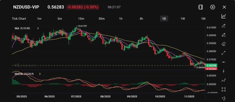 NZD/USD现报约0.5628,下跌0.50%,日线图显示持续看跌动能。价格徘徊在近期低点附近约0.5606,上周早些时候在此找到短期支撑。