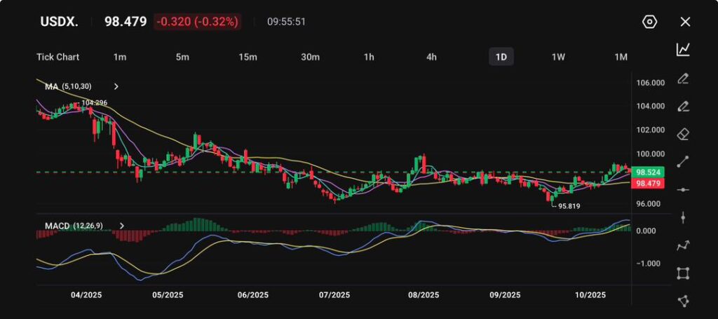 近期在99.00–99.20区域遭遇的回落,显示短期动能或暂时放缓。目前指数在30日均线附近徘徊,5日与10日均线逐渐趋同,暗示可能进入盘整阶段。
