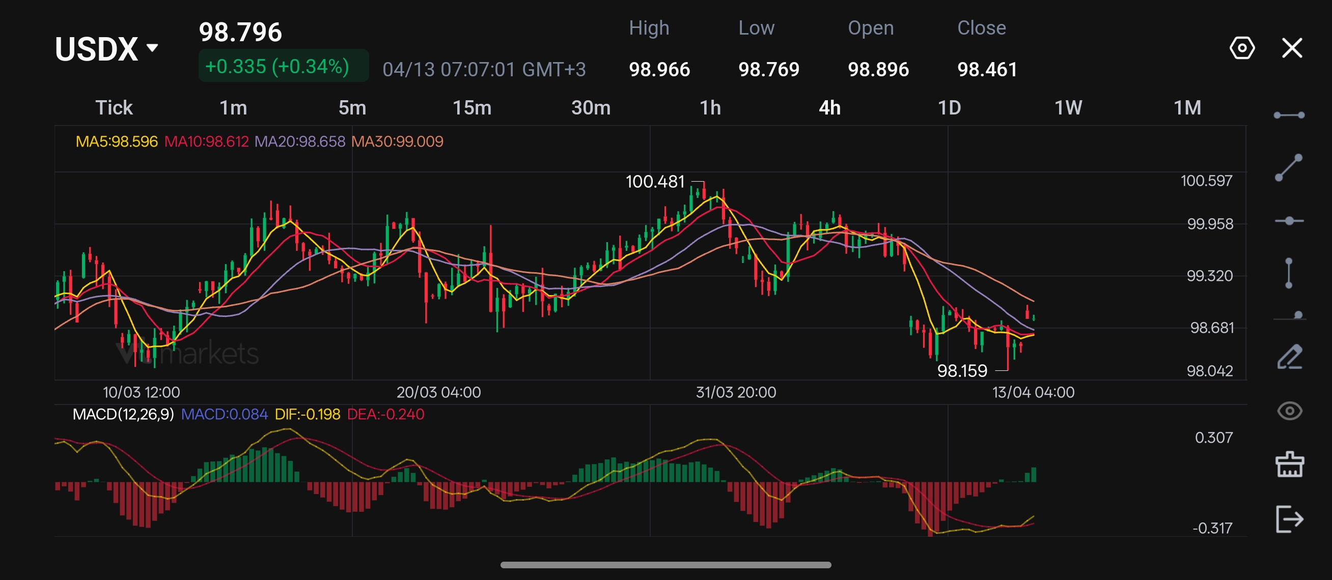 - 支撑(可能止跌的位置):98.42 -> 98.2 -> 97.9