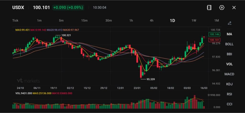 美元指数(USDX)最新在100.10附近交易,当天小幅走高,并数周来首次站上关键的100心理关口(市场普遍关注的整数价位)。这波上涨延续了年内自95.34低位以来的反弹,显示短期对美元的需求增强。