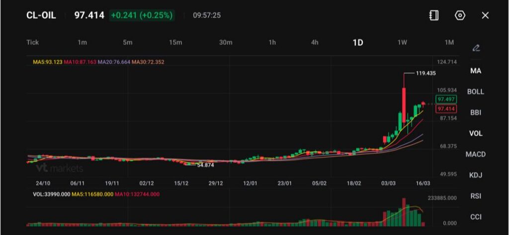 WTI原油(美国西德州中质原油,常作为国际油价基准之一;CL-OIL为常见报价代码)在97.41美元附近交易,当日小幅走高。此前油价急升至接近119.43美元高位后,目前在90多美元区间整理,显示市场在经历本月早些时候的大幅波动后,尝试寻找新的“平衡价位”(供需暂时稳定的价格区间)。