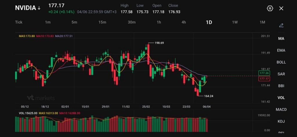 NVIDIA 现报 177.17,在早前下跌并触及 164.24 低位后,尝试小幅反弹。短线走势显示抛售(sell-off,快速下跌)后买盘介入,但整体结构仍偏弱,原因是此前从 198.69 高位回落未能突破。