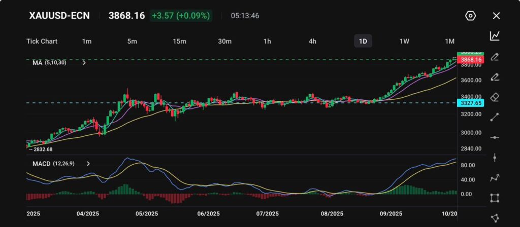黄金(XAUUSD)在纪录高位附近保持坚挺,当日上涨0.09%,报3868.16。自8月底以来,黄金的强劲上升势头持续延伸,受到避险需求、美国国债收益率回落以及地缘政治不确定性上升的共同推动。