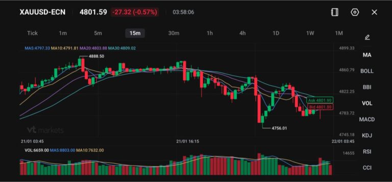黄金(XAUUSD)回落至 4,801.59,日内下跌 0.57%。在未能有效站稳 4,888.50 阻力位后,短期看跌动能开始显现。