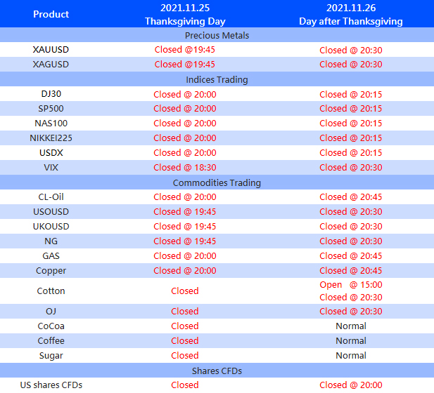 受感恩节、感恩节翌日影响,VT Markets 部分产品交易时间将有所调整,详情请查看如下: