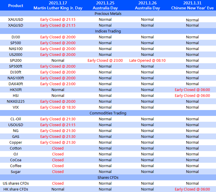 受到1月国际节假日影响,VT Markets 部分产品交易时间将有所调整,详情请查看如下: