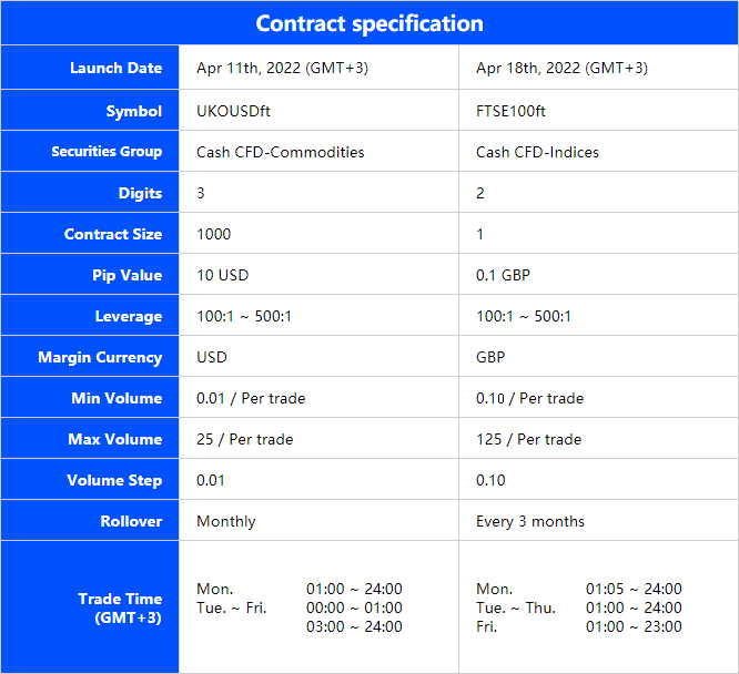 VT Markets 为进一步丰富广大客户的投资选择,我们预计将于近日新增 2 只合约:UKOUSDft、FTSE100ft。
