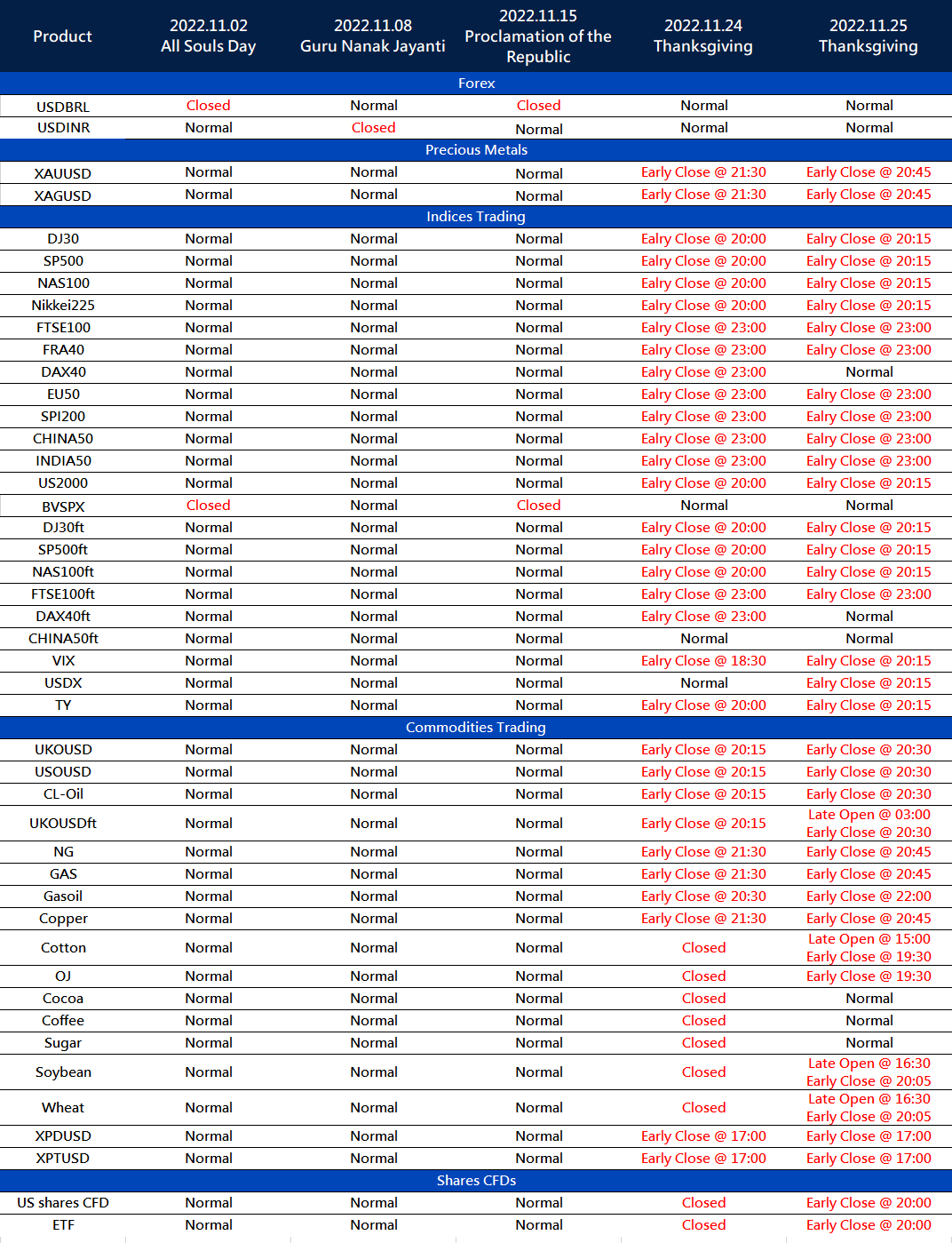受到 11 月国际节假日影响,VT Markets 部分产品交易时间将有所调整,详情请查看如下: