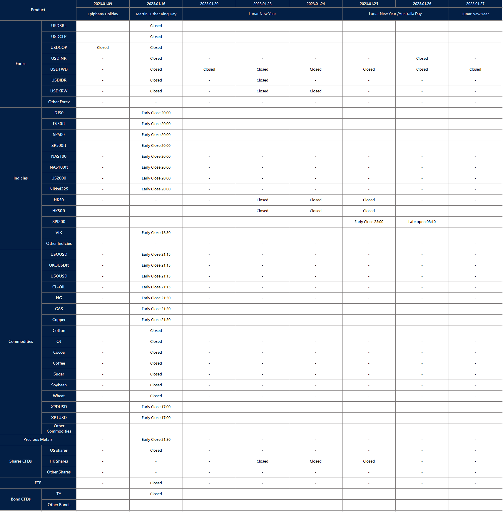 您好!受到国际节假日影响,VT Markets 部分产品交易时间将有所调整,详情请查看如下: