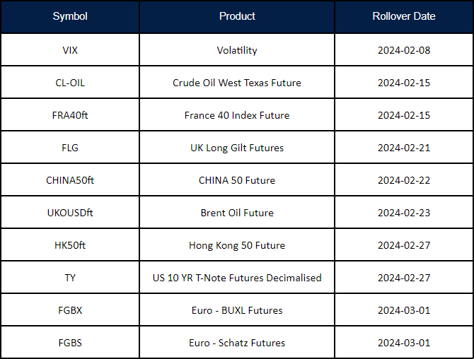 VT Markets 平台的部份期货产品即将于以下时间展开新合约,如持仓过夜将对换约造成的额外盈亏进行扣补。详情请见下方表格: