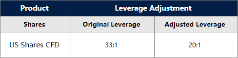 1. MT4、MT5 的 US 美股产品从原杠杆 33:1 调整为 20:1。