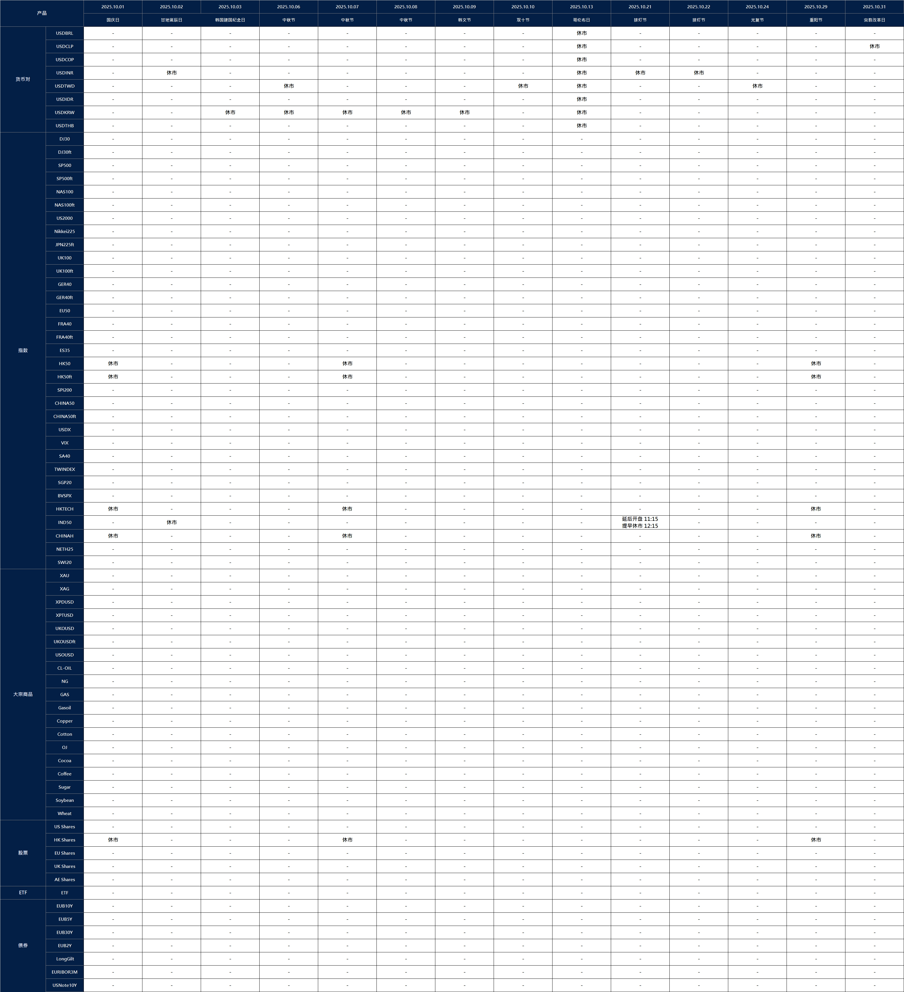 以上时间为 MT4/MT5 服务器时间,在极少数情况下,以上信息可能会因流通性供应商的调整而变化,具体请以 MT4/MT5 实际交易时间为准。