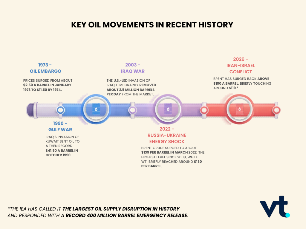 这类情况在近代史多次上演:只要战争可能影响产油或运输路线,就容易引发能源价格冲击(价格突然大涨)。